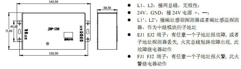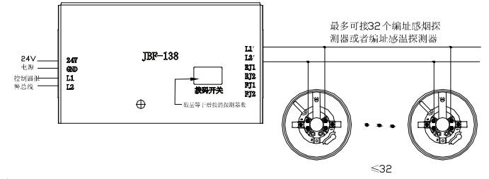7、獨立報警功能。JBF-138模塊無需與控制器連接即可以獨立連接探測器并進行工作。模塊后連接的子地址報火警后,JBF-138模塊直接對報火警子地址進行確認并點亮報警探測器火警確認燈,同時模塊上的指示燈長亮;